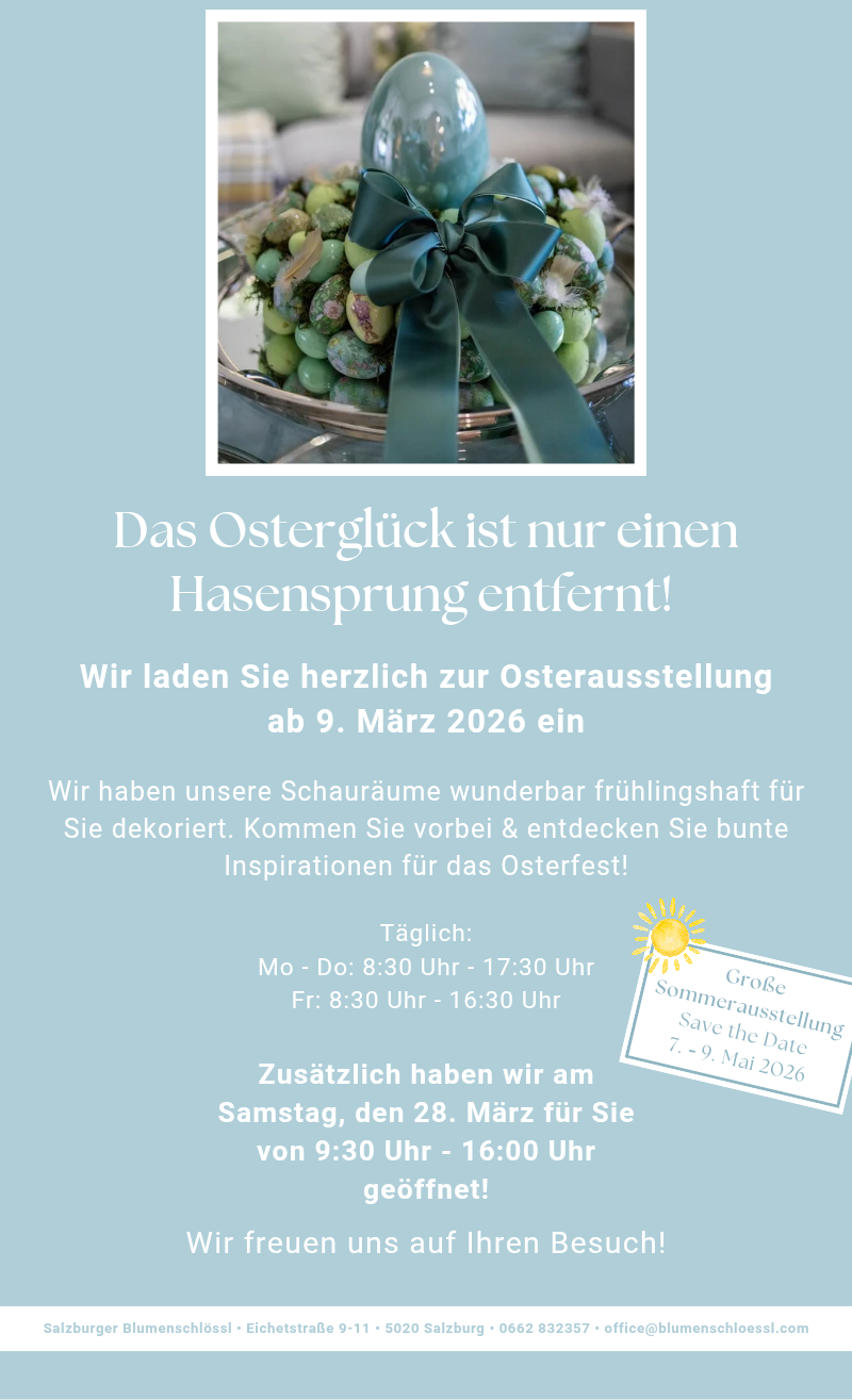 Im Salzburger Blumenschlössl finden Sie die unvergängliche Schönheit und beste Alternative zur Natur, die Seidenblume. Mit mehr als 30 Jahren Erfahrung verbinden wir Kunst und Blumen in höchster Qualität in der hauseigenen Meisterwerkstatt. Bei uns erhalten Sie alles von Gestecken, über In- und Outdoor Pflanzen bis hin zu Accessoires für ein ästhetisches Zuhause oder eine stimulierende Einrichtung. Alle unsere Arrangements sind Unikate und von Hand gemacht. Wir freuen uns, Sie jederzeit bei uns im Blumenschlössl Salzburg begrüßen zu dürfen.